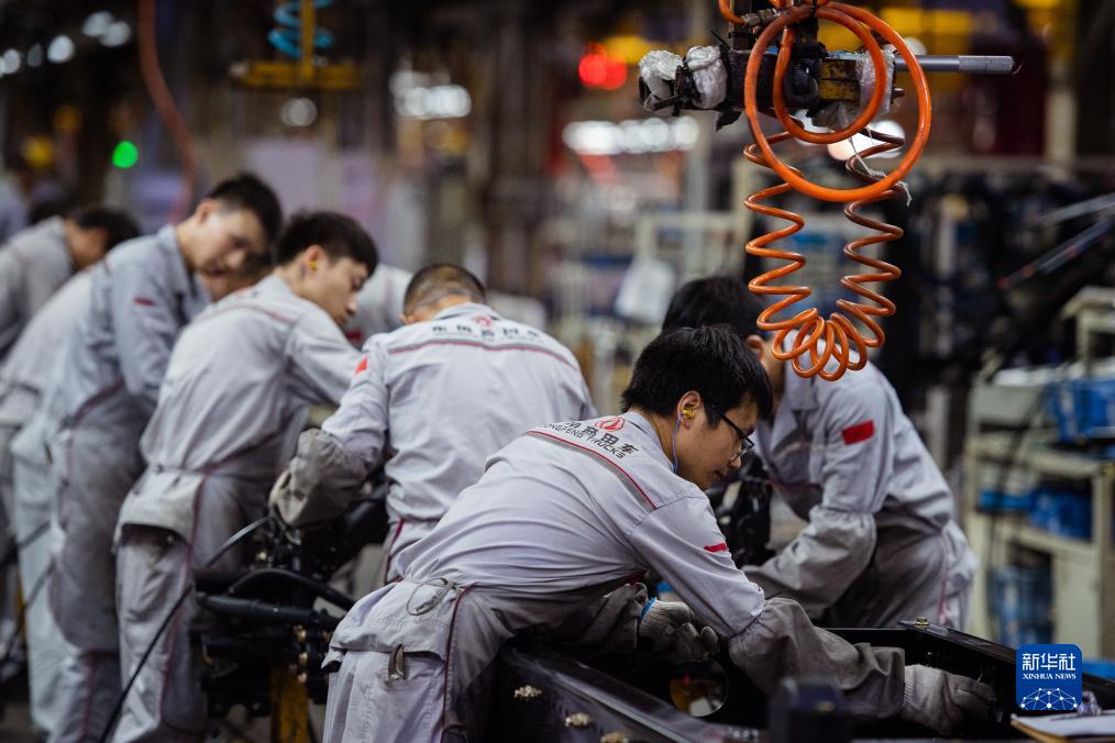 9月6日,在东风商用车有限公司车辆工厂,工人在进行整车管线束铺设作业。