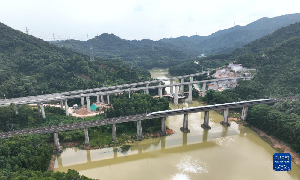 9月6日,广深港铁路列车从在建的深江铁路深圳段阳台山隧道旁驶过(无人机照片)。