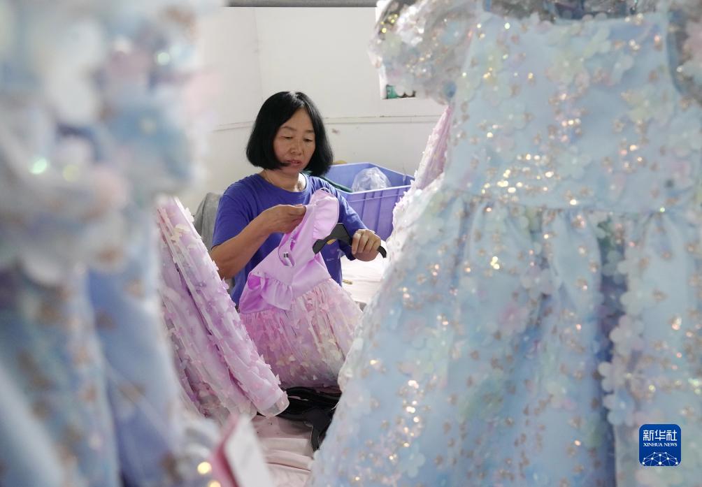 9月6日,工人在遵化市石门镇一家服装加工企业的成品车间整理童装。