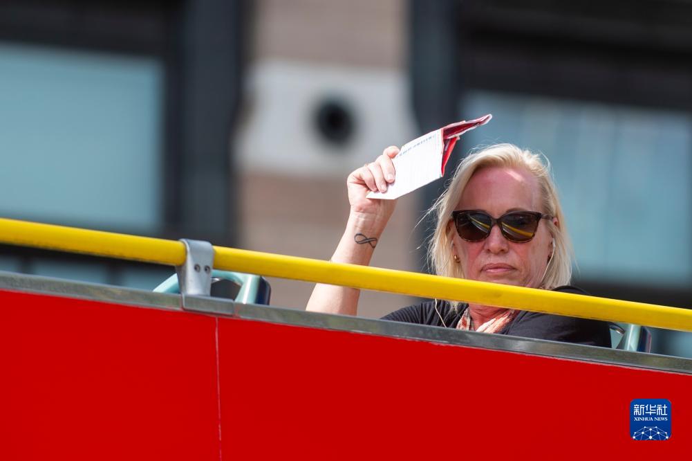 9月6日,一名女子在英国伦敦乘坐观光巴士。
