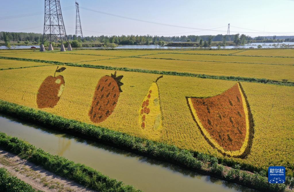 初秋时节,辽宁省鞍山市台安县辽河文化旅游景区的稻田画吸引不少游客前来参观游览。由多种颜色组成的巨型稻田画勾勒出丰收壮美景象。