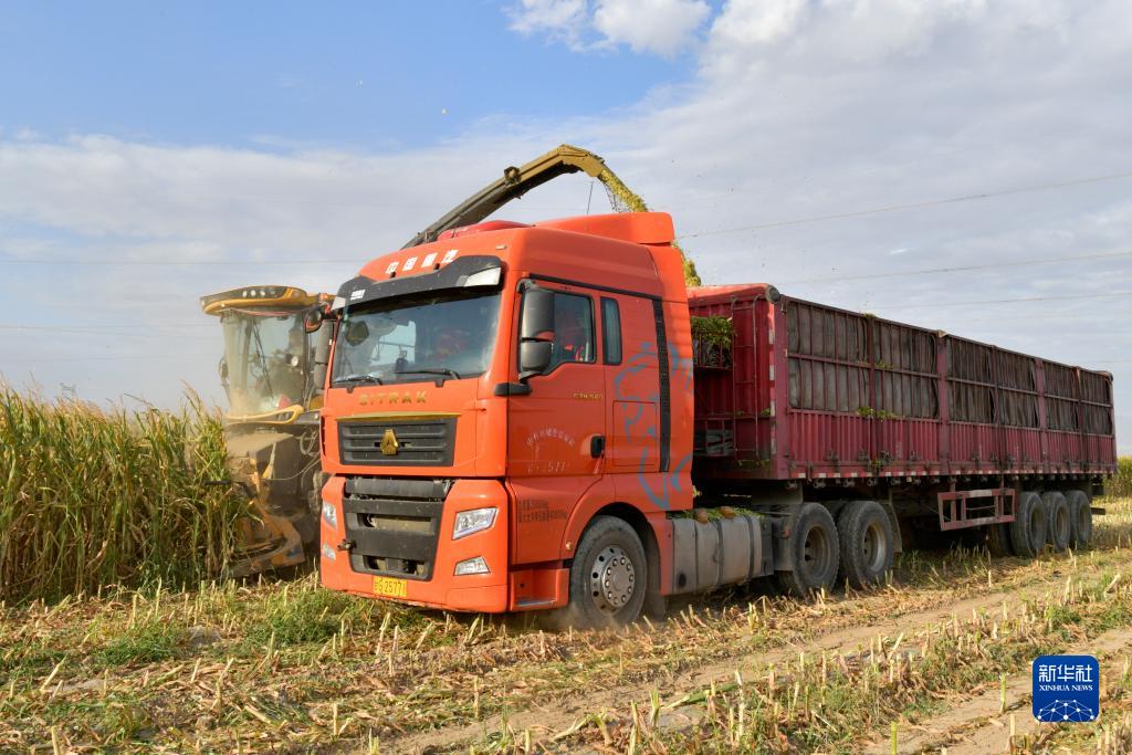 9月5日,在张掖市山丹县位奇镇四坝村,工作人员使用大型机械收获青贮玉米。