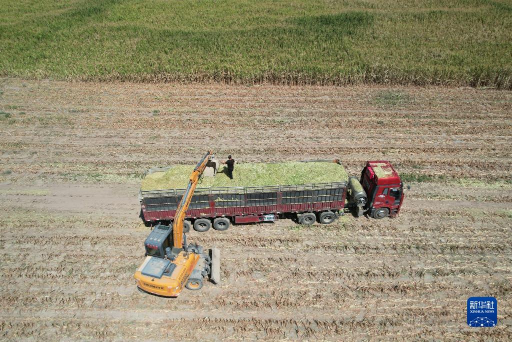 9月6日,在金昌市永昌县六坝镇八坝村,工作人员使用大型机械收获青贮玉米(无人机照片)。