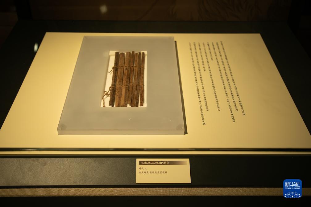 这是9月7日拍摄的甘肃简牍博物馆展出的由7枚简牍组成的“康居王使者册”。