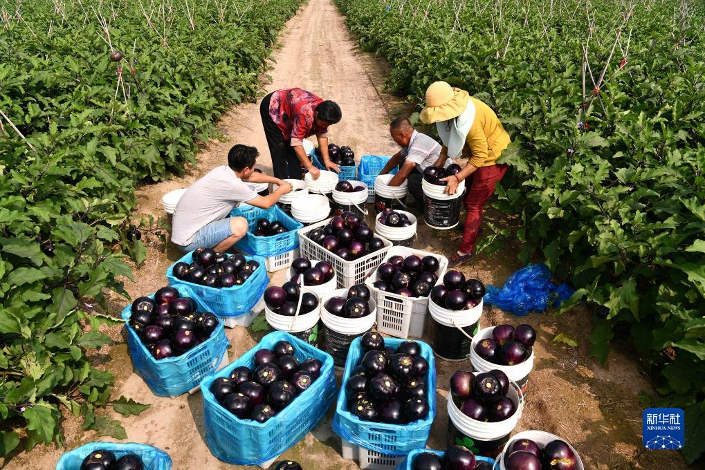 9月7日,在河北省石家庄市栾城区鲁家庄村,茄农将收获的茄子装箱,准备运往市场销售。