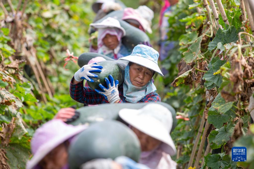 9月7日,农民在贵州省安顺市西秀区旧州镇浪塘村搬运采摘的冬瓜。
