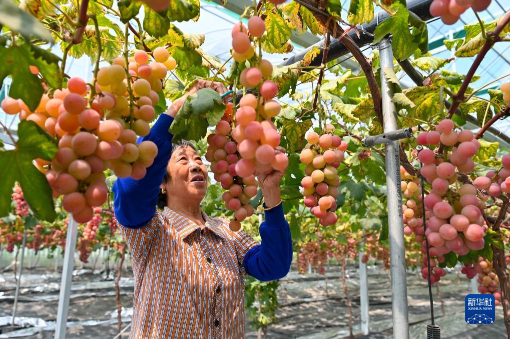 9月7日,在江苏省盐城市建湖县一处葡萄园,农业工人在采摘葡萄。