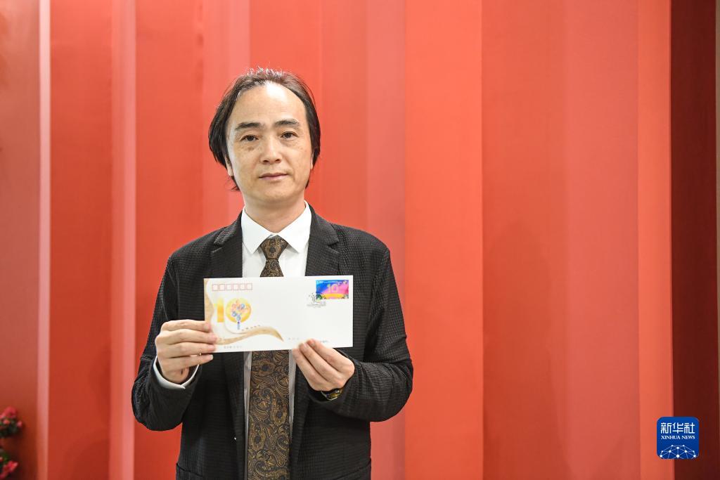 9月7日,“丝路金桥”景观作品创作者舒勇向记者展示含有“丝路金桥”元素的《“一带一路”倡议提出十周年》纪念邮票及首日封。