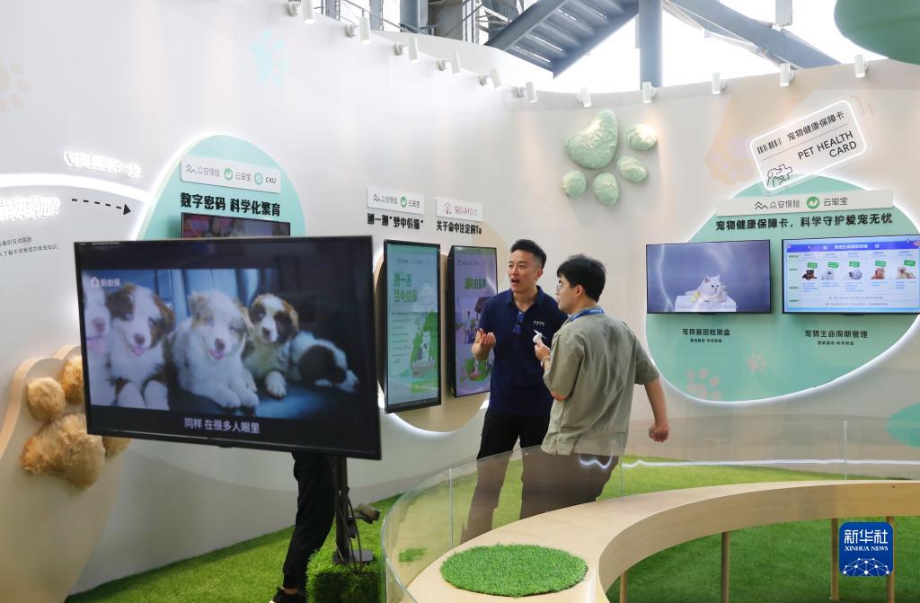 9月7日,参观者在外滩大会展览区宠物之家展台内交流讨论。