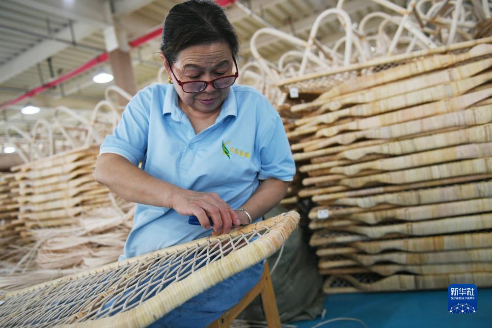 9月7日,在位于汉中市的陕西良顺匠心实业有限公司,工作人员在编织藤制品。