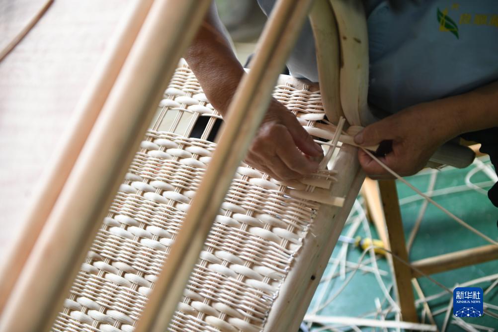 9月7日,在位于汉中市的陕西良顺匠心实业有限公司,工作人员在编织藤椅。