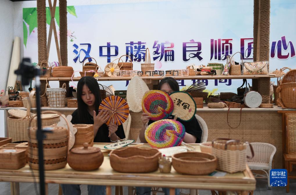 9月7日,在位于汉中市的陕西良顺匠心实业有限公司,工作人员在直播推荐藤编工艺品。