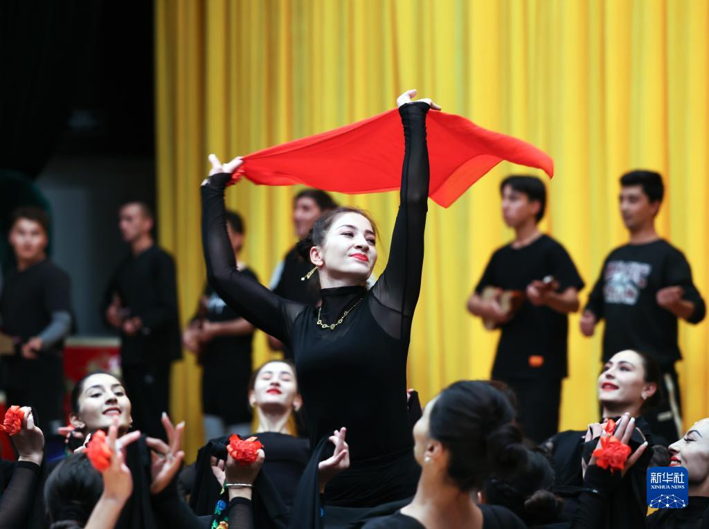 古丽巴努尔·库尔恰克和同事们在排练舞蹈节目《花儿为什么这样红》(9月4日摄)。