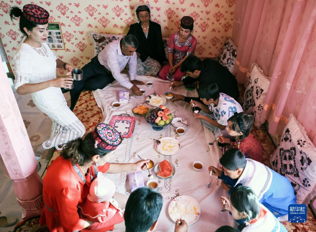 拜合提亚尔·居马汗一大家人在家中吃晚饭(9月4日摄)。