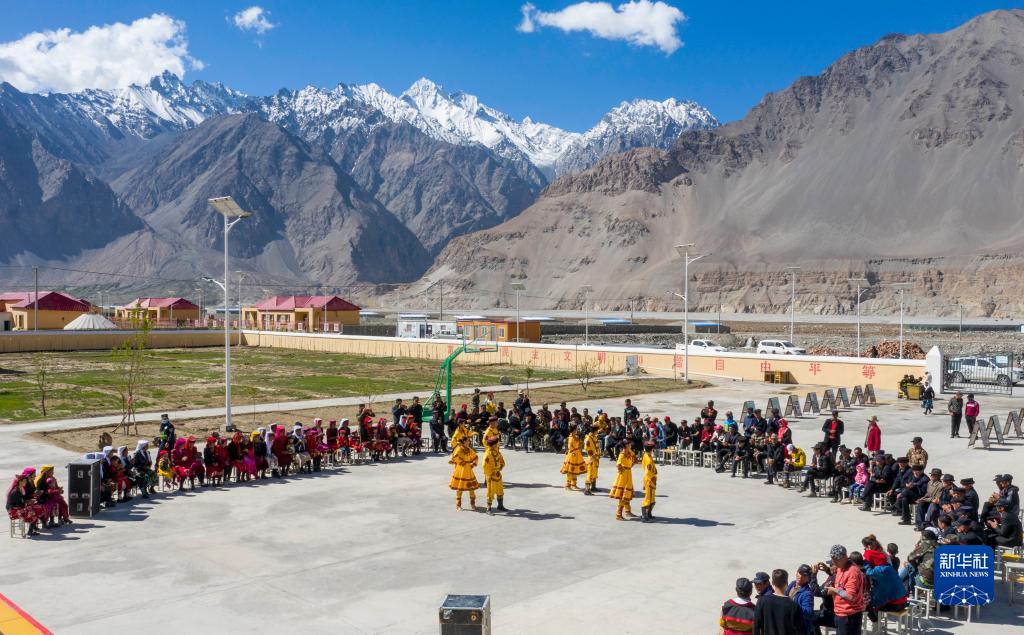 新疆塔县文工团演员古丽巴努尔·库尔恰克和同事们在达布达尔乡的一处山村为村民表演舞蹈节目(2020年6月6日摄,无人机照片)。