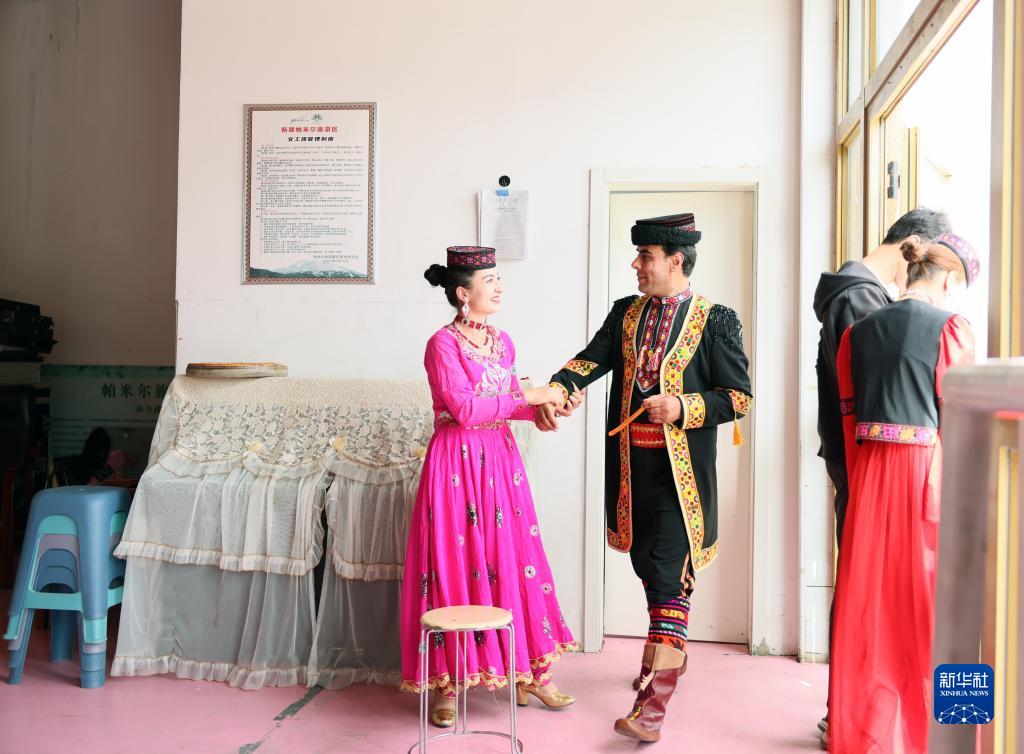 迎宾演出在即,拜合提亚尔·居马汗(左二)和妻子在排练室准备(9月4日摄)。