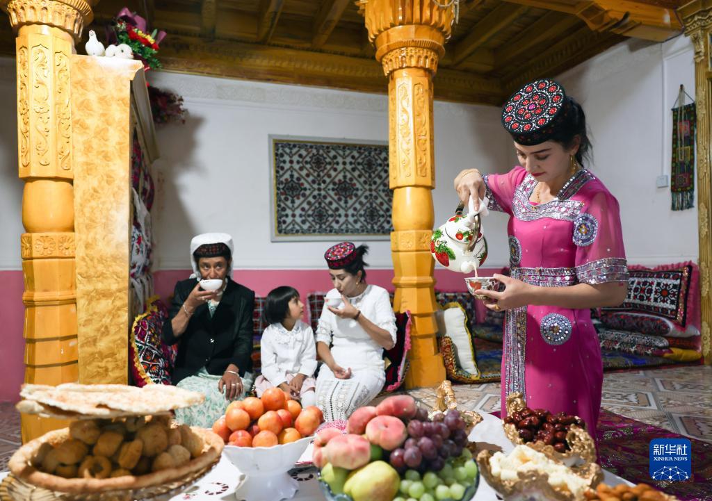 回到家中的古丽巴努尔·库尔恰克(右)为家人们倒上奶茶(9月4日摄)。
