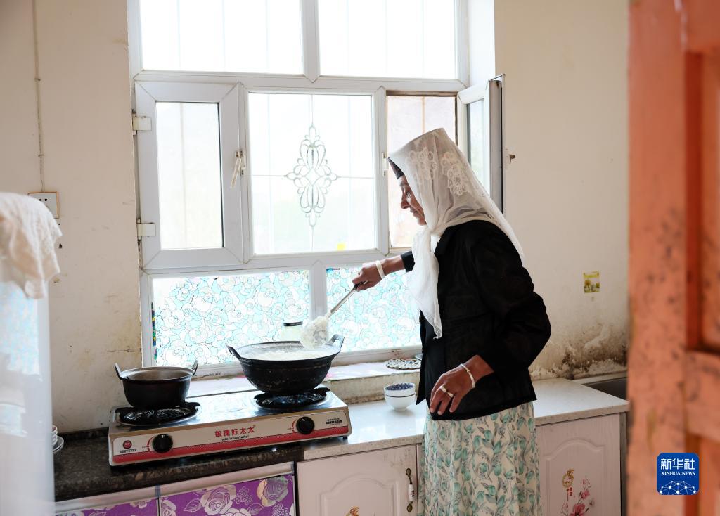 拜合提亚尔·居马汗的母亲在家中做晚饭(9月4日摄)。