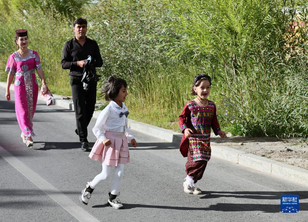 放学路上,拜合提亚尔·居马汗和妻子走在路上,望着前方奔跑嬉闹的女儿(前右)和侄女(9月4日摄)。