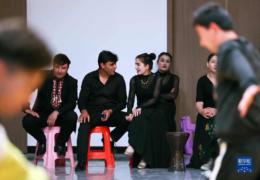 拜合提亚尔·居马汗和妻子在排练间歇聊天(9月4日摄)。