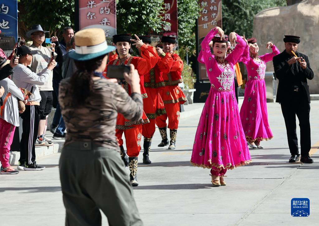 古丽巴努尔·库尔恰克和同事们一起为远道而来的游客起舞,展示当地特色迎宾仪式(9月4日摄)。