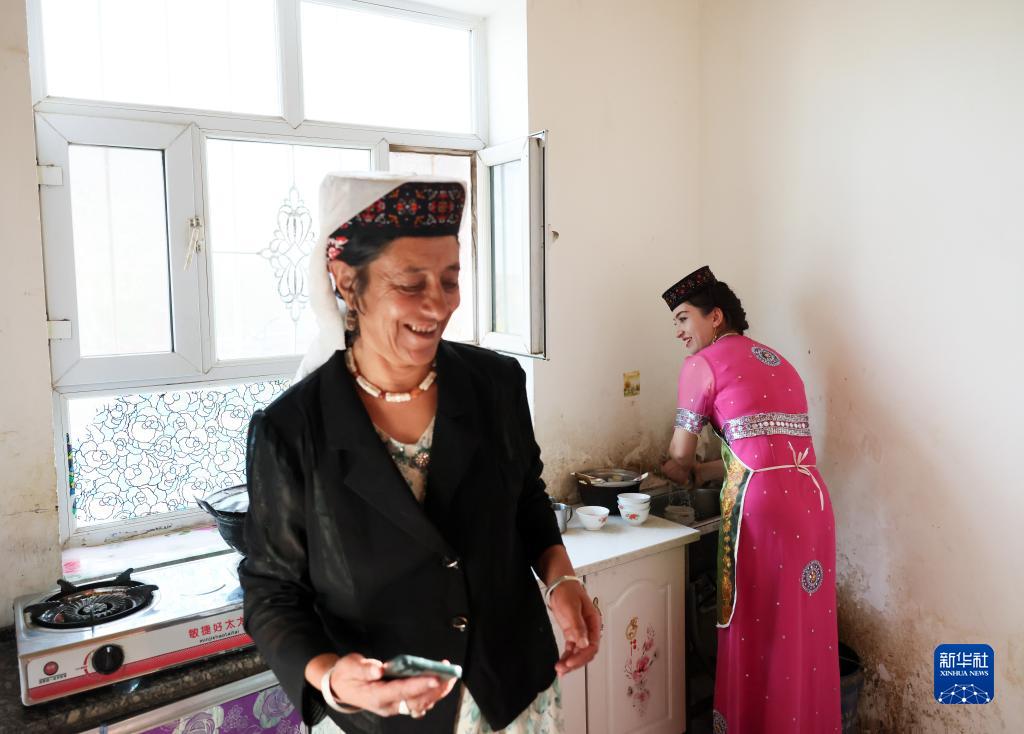 晚饭过后,古丽巴努尔·库尔恰克在厨房洗碗,婆婆在一旁和她拉家常(9月4日摄)。