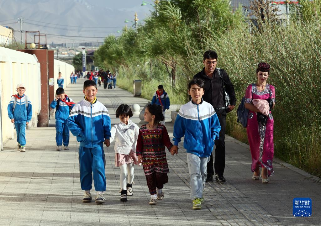 拜合提亚尔·居马汗和妻子带着孩子们回家(9月4日摄)。