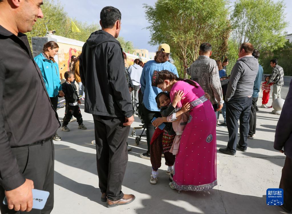 从幼儿园放学的女儿迪力巴努扑向妈妈的怀抱(9月4日摄)。