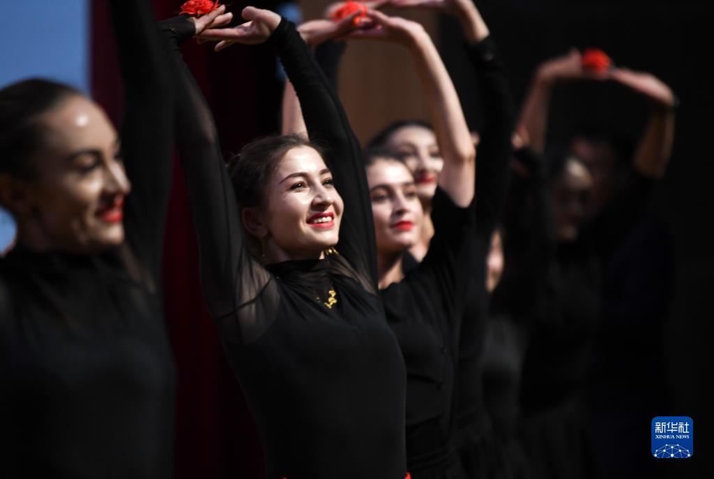 古丽巴努尔·库尔恰克(左二)和同事们在排练舞蹈节目《花儿为什么这样红》(9月4日摄)。