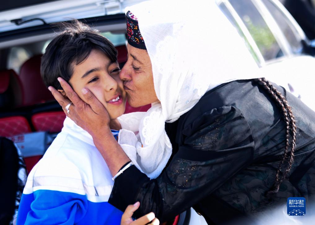 拜合提亚尔·居马汗的母亲亲吻刚刚放学回家的孙子木拉夏提(9月4日摄)。