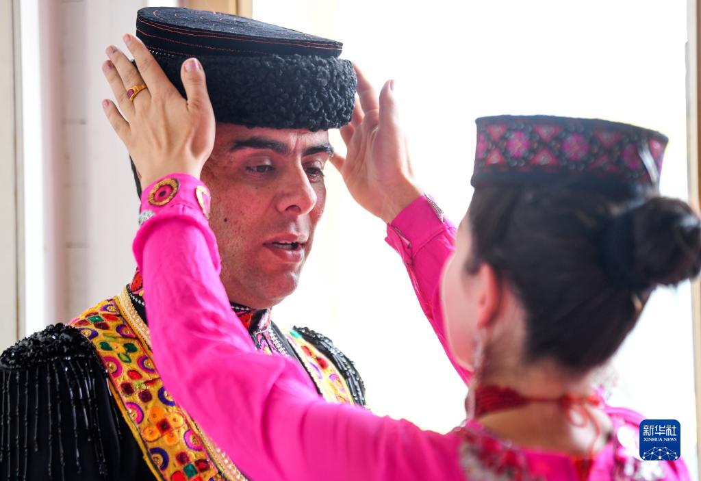 在新疆塔县帕米尔旅游区游客服务中心,拜合提亚尔·居马汗的妻子在排练室帮他整理服饰,准备当天下午的迎宾演出(9月4日摄)。