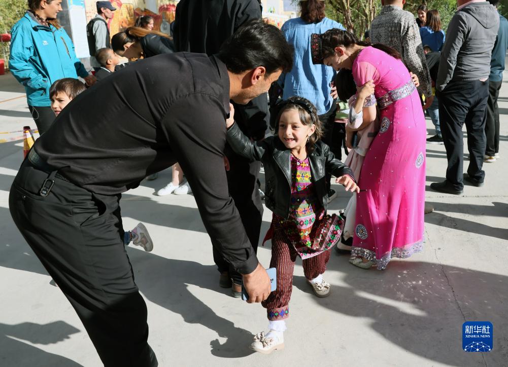 拜合提亚尔弯腰准备抱起从幼儿园放学的女儿迪力巴努回家(9月4日摄)。