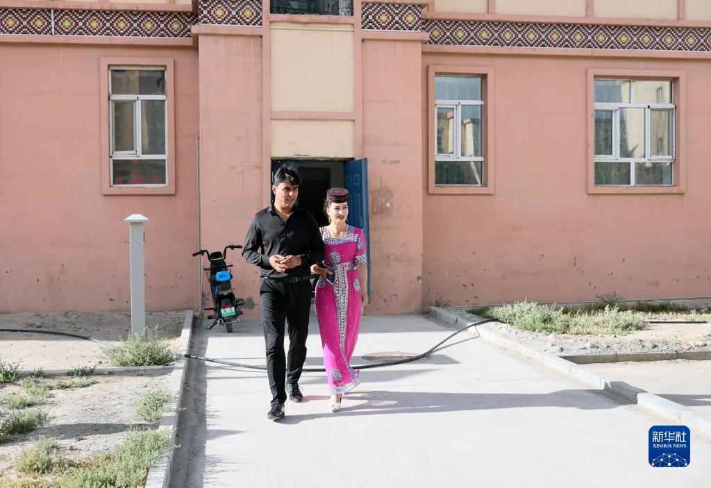 下班后,拜合提亚尔·居马汗和妻子并肩走在位于县城的新家楼下(9月4日摄)。