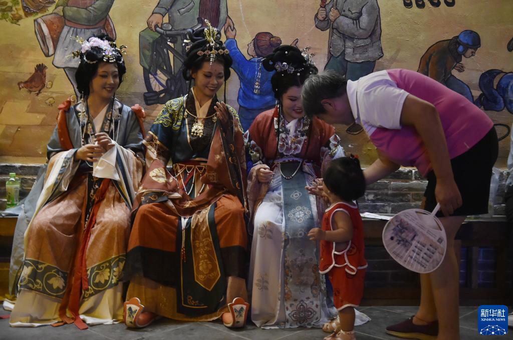 9月7日晚,身穿古装的游人在安阳古城县前街的夜游活动现场与小朋友互动。