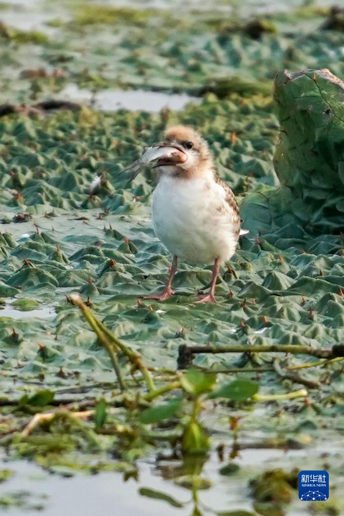 在江苏省盐城市建湖县九龙口国家湿地公园内,须浮鸥幼鸟在进食(9月7日摄)。