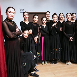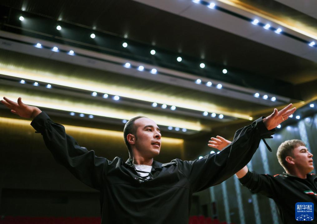 新疆塔县文工团舞蹈演员布力布力·加米力(左)和同伴在排练舞蹈节目《鹰笛之声》(9月4日摄)。