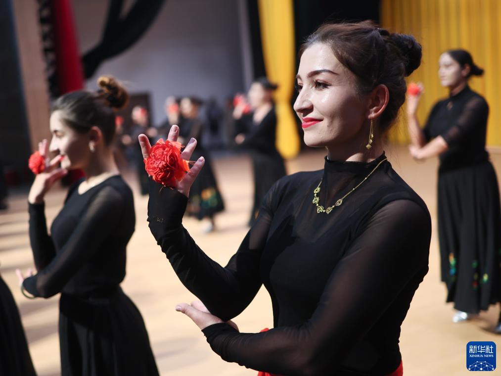 新疆塔县文工团舞蹈演员古丽巴努尔·库尔恰克(右)和同伴们一起排练《花儿为什么这样红》(9月4日摄)。新华社记者 兰红光 摄