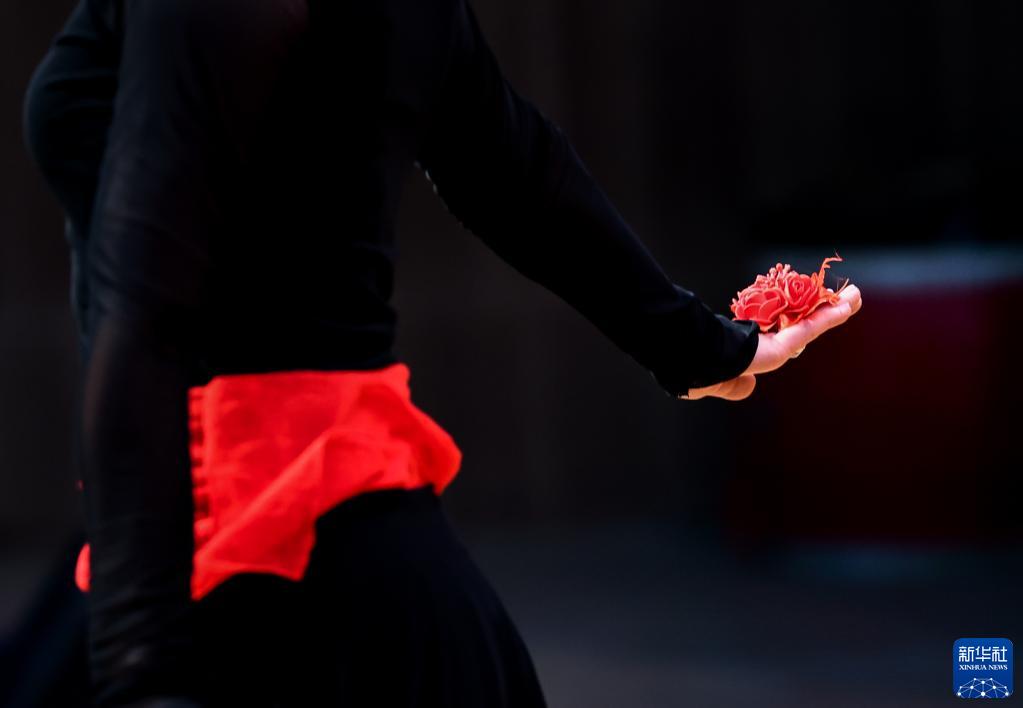 新疆塔县文工团舞蹈演员古丽巴努尔·库尔恰克(右)在排练《花儿为什么这样红》(9月4日摄)。新华社记者 兰红光 摄