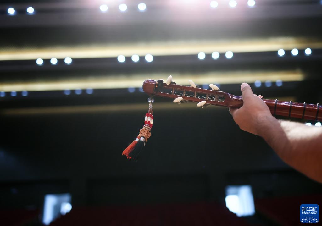 一名新疆塔县文工团乐手在排练时弹奏热瓦普(9月4日摄)。新华社记者 兰红光 摄