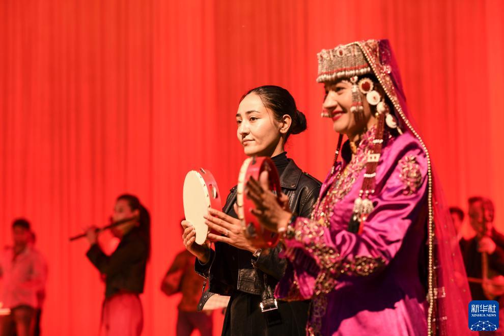 新疆塔县文工团乐手在排练节目《丝路遗梦》时演奏铃鼓(9月7日摄)。新华社记者 胡虎虎 摄