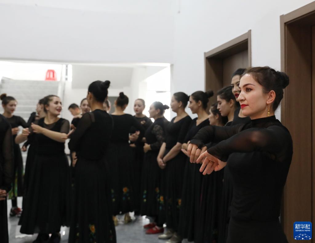 舞蹈演员古丽巴努尔·库尔恰克(右一)和同伴们在塔县文化服务中心剧场后台等候排练(9月4日摄)。新华社记者 程婷婷 摄