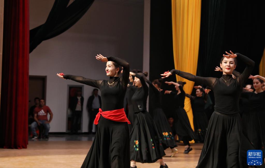 新疆塔县文工团舞蹈演员古丽巴努尔·库尔恰克(前左)和同伴们在排练节目《花儿为什么这样红》(9月4日摄)。新华社记者 程婷婷 摄