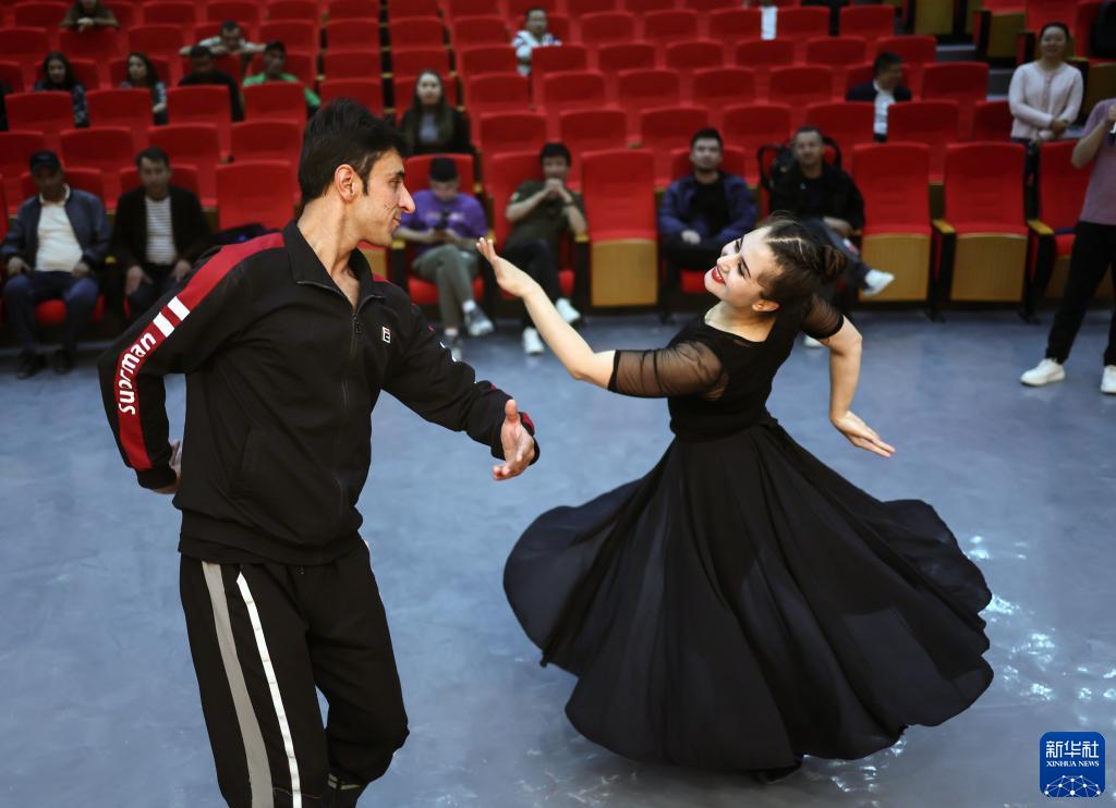 舞蹈演员巴合提拉·居马汗(左)和马热吾丽·赛力塔那提在排练节目《塔吉克婚礼》(9月4日摄)。新华社记者 兰红光 摄
