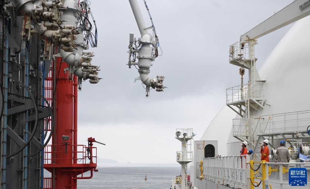 9月7日,广东大鹏液化天然气(LNG)接收站工作人员操作卸料臂与“能量自信”号运输船对接。