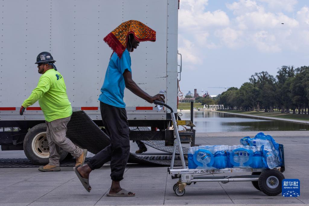 9月7日,在美国首都华盛顿,一名商贩运送瓶装水。
