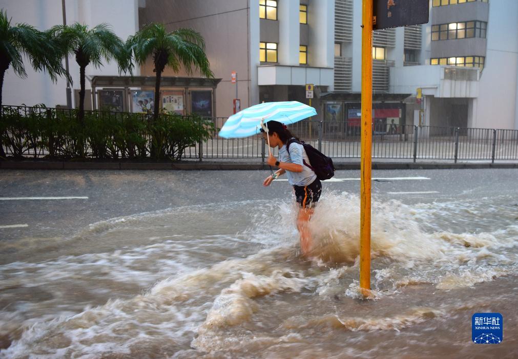 9月8日,一名女士在香港皇后大道东路段涉水前行。