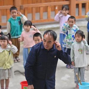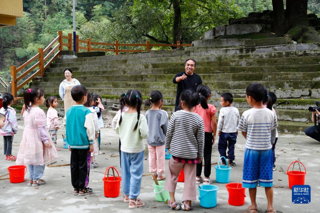 在乌英苗寨教学点,潘先锋(后排右)和同事在教新生学习排队(2023年8月30日摄)。