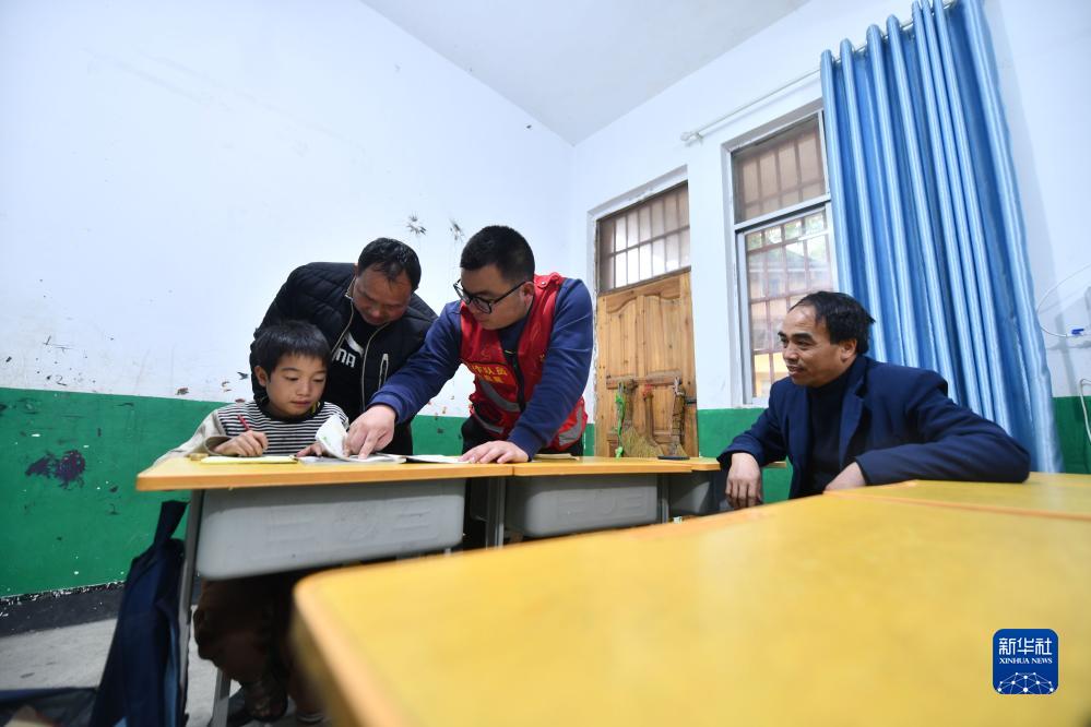 在乌英苗寨教学点,潘先锋(右一)、驻村工作队队员郑昌昊(右二)、村干部梁成张(右三)在教室里辅导学生学习(2021年4月7日摄)。