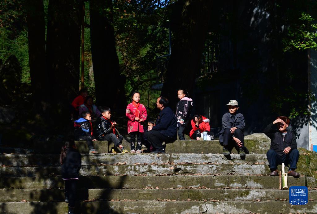 在乌英苗寨教学点,潘先锋(右五)在古树下与孩子们交流(2021年11月25日摄)。