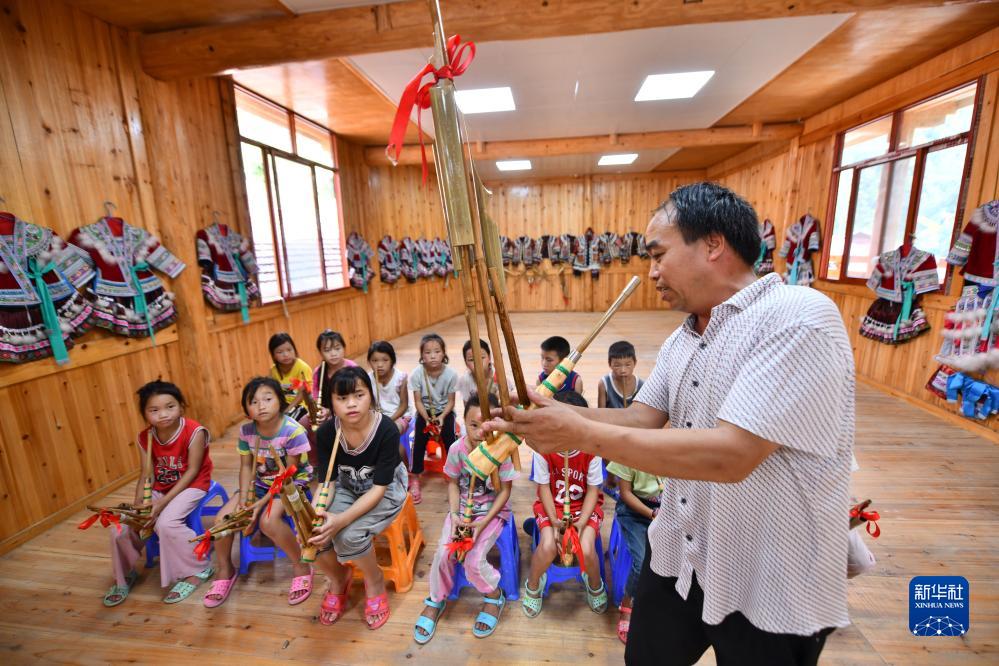 在乌英苗寨教学点,潘先锋在非遗课堂上教孩子们吹芦笙(2021年7月15日摄)。